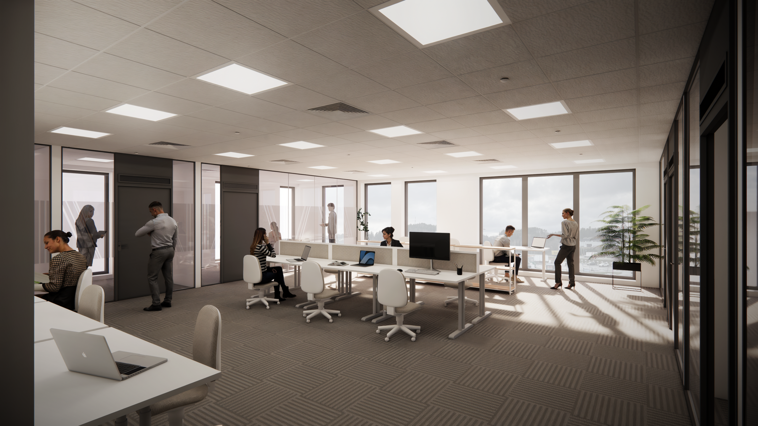 Kontorlokalene er fordelt på to fløyer bundet sammen av et mellombygg med felles kantine og uteområder. Det arealeffektive bygget får også et felles garderobeanlegg.